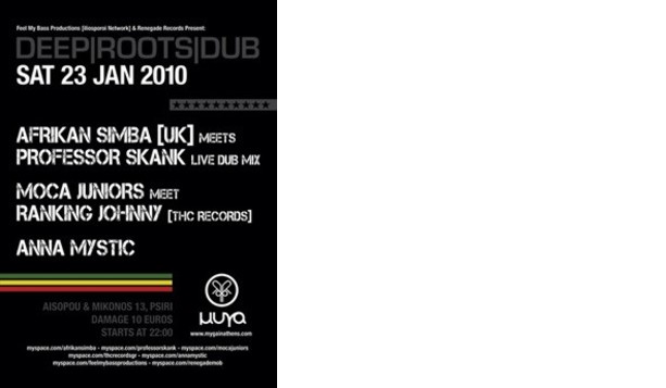 Η Μύγα κάνει ένα super Deep Roots Dub party κι έχει καλέσει μερικούς από τους σημαντικότερους εκπροσώπους της χορευτικής dub και reggae σκηνής. Ο Νιγηριανός MC Afrikan Simba θα έρθει απευθείας από το Λονδίνο για να συναντήσει τον dub παραγωγό Professor Skank και η παρέα των Moca Juniors από τη Βόρεια Ελλάδα μαζί με τον ιστορικό reggae selector Ranking Johnny θα φροντίσουν να μην σταματήσεις το χορό ούτε λεπτό. Το after party θα αναλάβει η Anna Mystic. Ν.Λ.