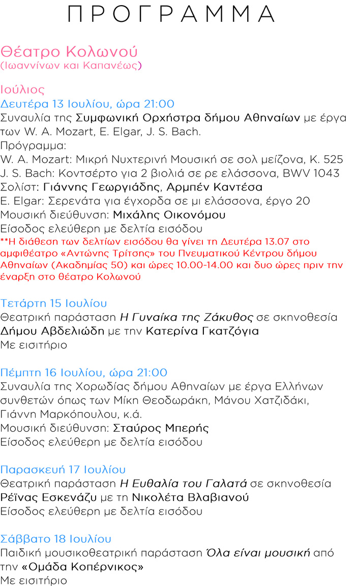 Δείτε παρακάτω το πρώτο μέρος των εκδηλώσεων από 13 Ιουλίου έως 8 Αυγούστου. Την αυλαία ανοίγει στο θέατρο Κολωνού στις 13.07 η Συμφωνική Ορχήστρα δήμου Αθηναίων υπό τη μουσική διεύθυνση του Μιχάλη Οικονόμου με προσκεκλημένους σολίστ τους Γιάννη Γεωργιάδη και Αρμπέν Καντέσα, ενώ το θέατρο Γκράβας υποδέχεται την ερμηνεύτρια Αναστασία Ζαννή στις 21.07